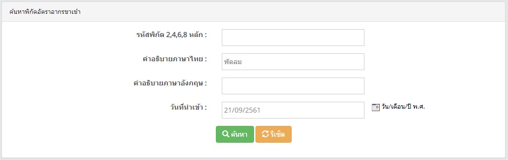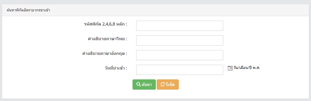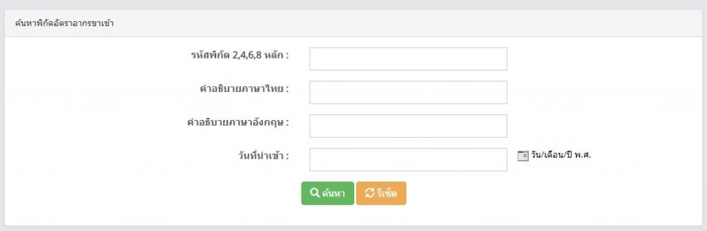 กรณีเราทราบพิกัดสินค้าแล้วให้เราใส่ตัวเลขพิกัดสินค้าในช่อง “รหัสพิกัด 2,4,6,8 หลัก” แล้ว เลือกค้นหา กรณียังไม่ทราบพิกัดสินค้า ให้เราค้นหาโดยใส่ชื่อสินค้าของเรา หรือ คำคีย์เวิร์ดต่างๆ ของสินค้าเรา โดยใช้คีย์หลักก่อน ในช่อง “คำอธิบายภาษาไทย” แล้วเลือกค้นหา