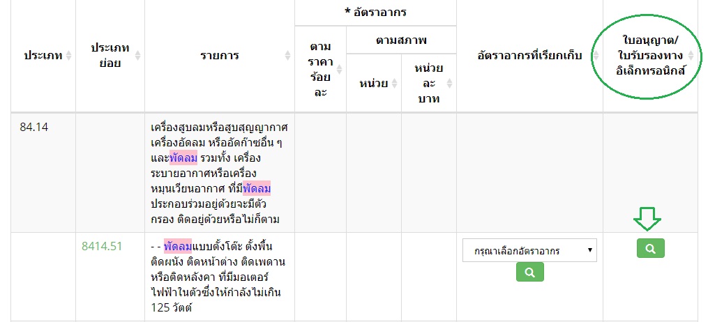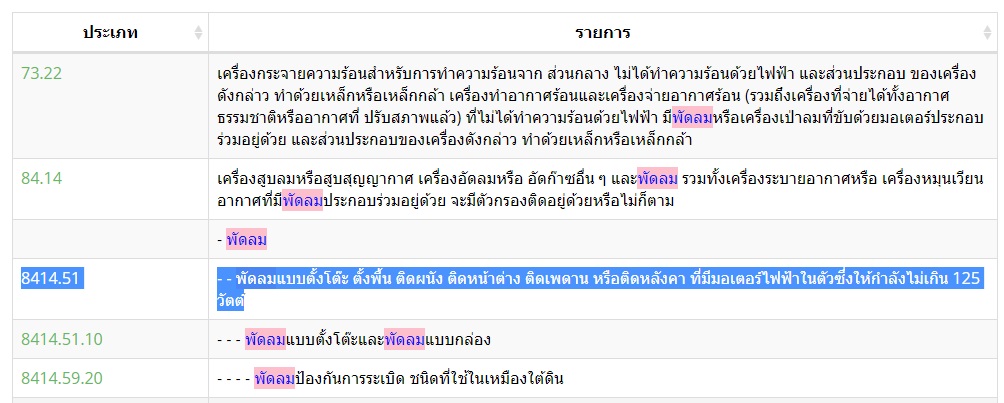 – จะเห็นว่ามีพิกัดขึ้นมาให้เลือกหลายพิกัด ให้เราเลือกที่รายละเอียดตรงกับสินค้าของเรา จากตัวอย่างเราจะเลือก ที่ “พัดลมติดผนัง” แล้วเลือกที่ตัวเลขพิกัด 8414.51